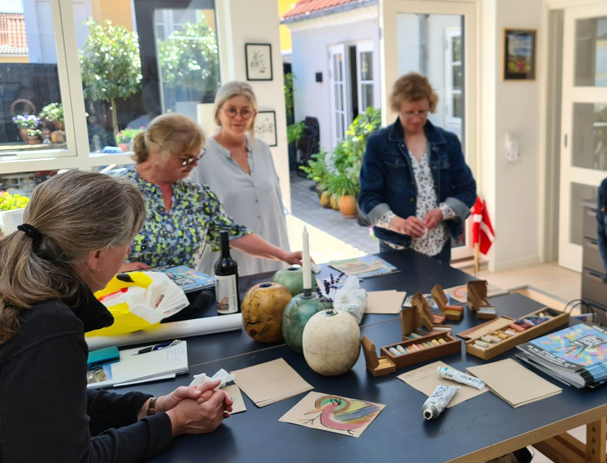 Sidste stop i Hirtshals var billedkunstner, Laila Pallisgaards attalier, som også bruges til undervisning. Her fik Inger og hendes bestyrelse lov til selv at prøve kræfter med farvekridt.