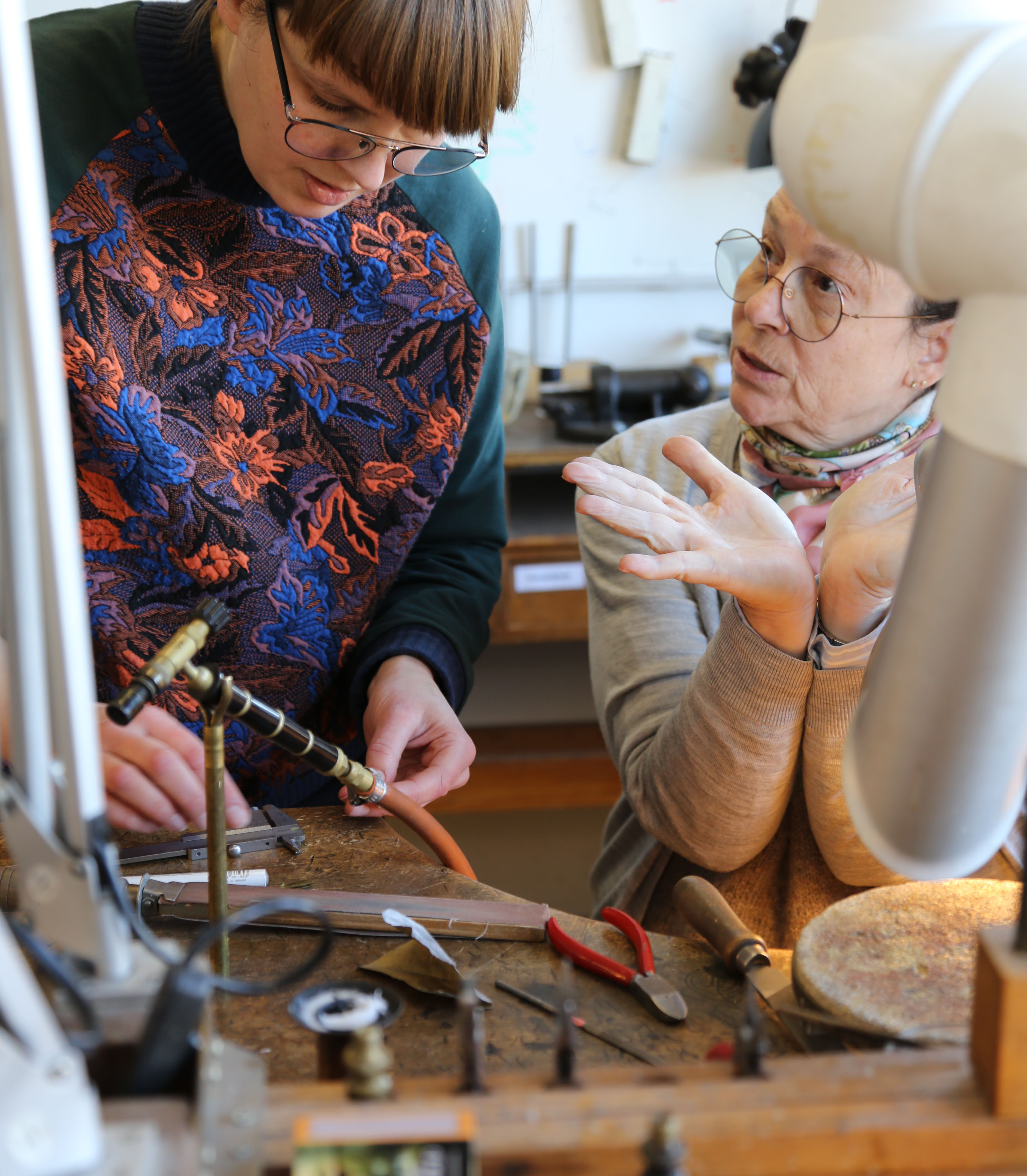 Gitte Bjørn står for dagens undervisning og er ved siden af at være udøvende smykkekunstner helt central på Smyk2000. Det er hendes værksted, skolen bruger, og hun overtog det i 2009 fra grundlæggeren, Carsten From. Udover værkstedet over tog Gitte også værdierne – ikke mindst et højt ambitionsniveau.